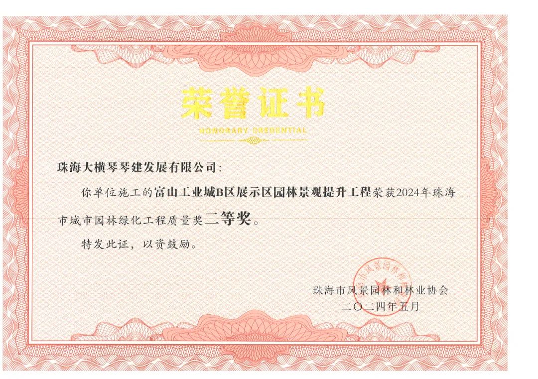 橫琴粵澳深度合作區(qū)城市規(guī)劃和建設(shè)局市政管理署2023年專類公園綜合管養(yǎng)政府采購項目、橫琴粵澳深度合作區(qū)城市規(guī)劃和建設(shè)局二井灣濕地公園一期管理用房改造項目工程施工政府采購項目,榮獲2024年珠海市城市園林綠化工程質(zhì)量獎一等獎!富山工業(yè)城B區(qū)展示區(qū)園林景觀提升工程,榮獲2024年珠海市城市園林綠化工程質(zhì)量獎二等獎!