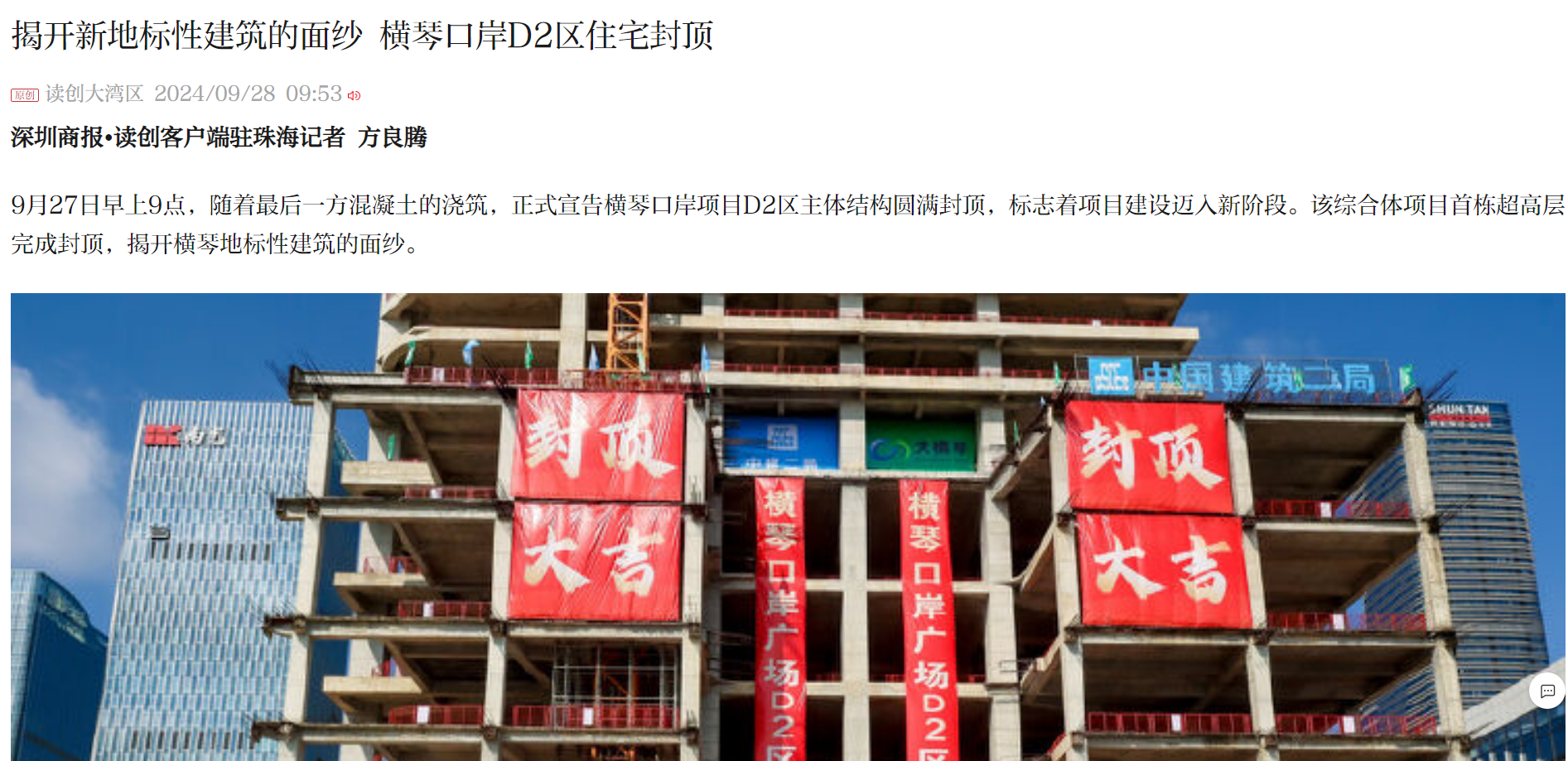 9月27日早上9點,隨著最后一方混凝土的澆筑,正式宣告橫琴口岸項目D2區(qū)主體結(jié)構(gòu)圓滿封頂,標志著項目建設(shè)邁入新階段。該綜合體項目首棟超高層完成封頂,揭開橫琴地標性建筑的面紗。