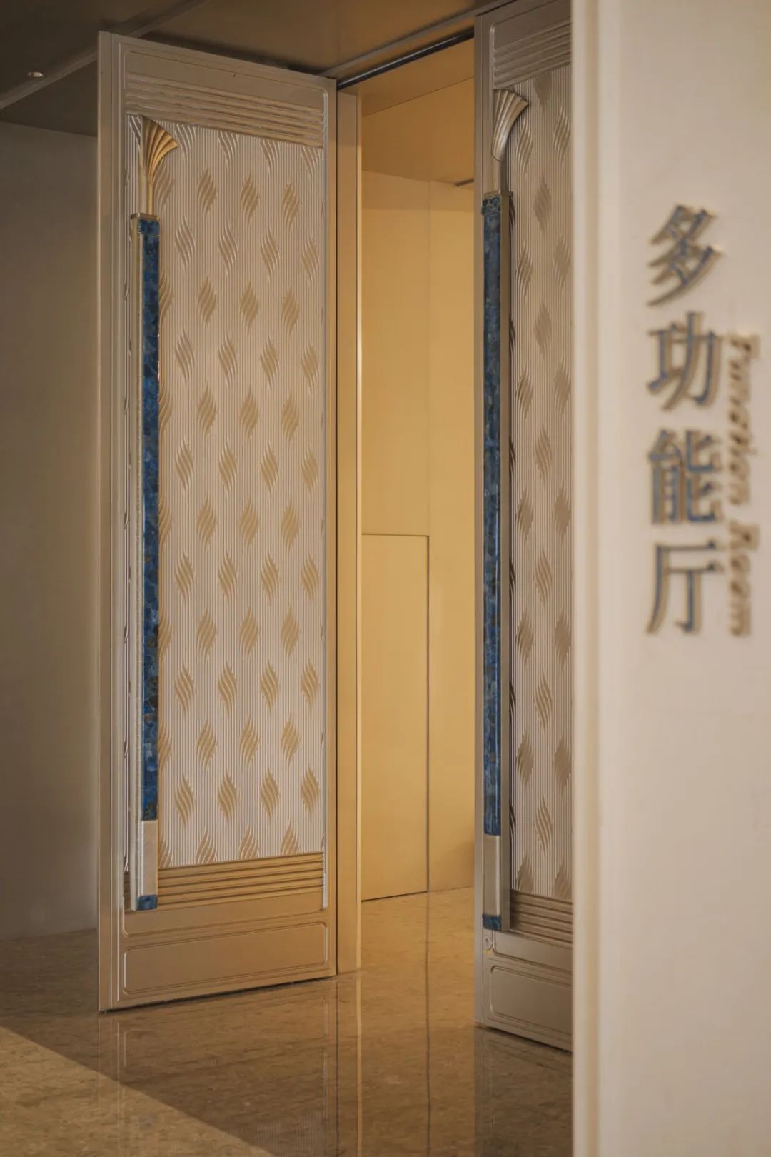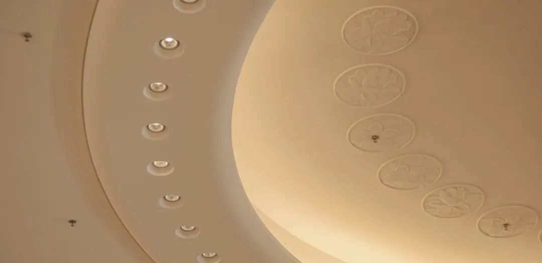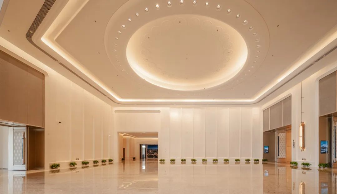 會(huì)議中心前廳頂面采用25朵花代表澳門回歸祖國(guó)25周年,造型中提取木棉花、蓮花寫意形體作為裝飾元素,圖案相互交錯(cuò),寓意“一國(guó)兩制”方針下粵澳共商、共建、共管、共享的新模式。