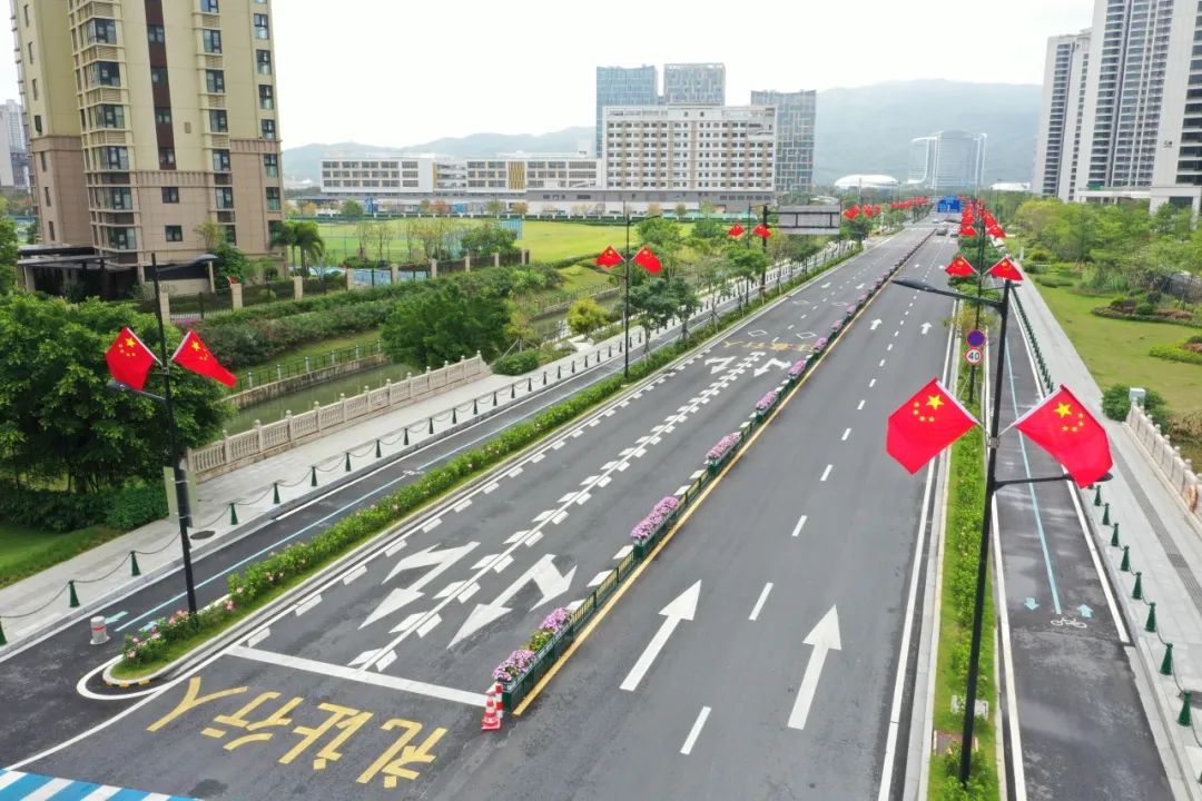 鮮艷的五星紅旗迎風(fēng)招展,與藍(lán)天白云相映成輝,為道路注入莊嚴(yán)喜慶、歡樂祥和的節(jié)慶氣息。