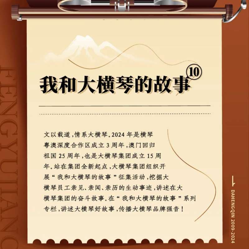 文以載道,情系大橫琴。2024年是橫琴粵澳深度合作區(qū)成立3周年,澳門(mén)回歸祖國(guó)25周年,也是大橫琴集團(tuán)成立15周年。站在集團(tuán)全新起點(diǎn),大橫琴集團(tuán)組織開(kāi)展“我和大橫琴的故事”征集活動(dòng),挖掘大橫琴員工親見(jiàn)、親聞、親歷的生動(dòng)事跡,講述在大橫琴集團(tuán)的奮斗故事。大橫琴集團(tuán)公眾號(hào)將陸續(xù)推出“我和大橫琴的故事”系列專欄,講述大橫琴好故事,傳播大橫琴品牌強(qiáng)音!